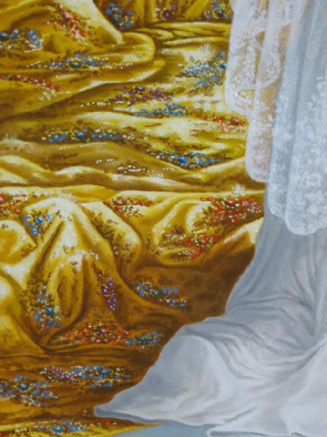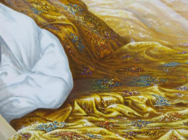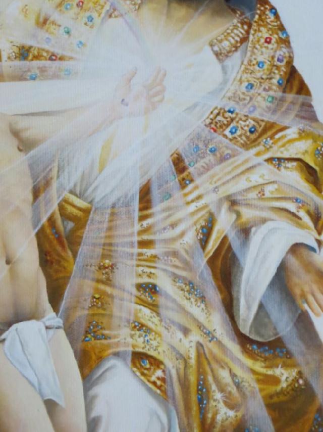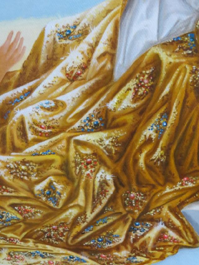 Ausschnitt goldener Mantel als Symbol für die Gerechtigkeit, geschmückt mit Edelsteinen